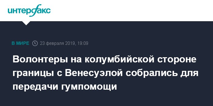 Москва. 23 февраля. INTERFAX.RU - Группы волонтеров в районе колумбийского города Кукута на границе с Венесуэлой ожидают возможности пройти на мост, по которому проходит граница между странами, для того, чтобы начать передачу гуманитарной помощи, сообщает телеканал TV Cucuta.