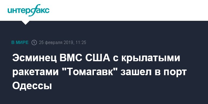 Американский эсминец, несущий до 56 крылатых ракет "Томагавк" с дальностью действия 1,6 тыс. км, пришвартовался у пирса вблизи Одесского морского вокзала. Корабль пробудет в Одессе до 27 февраля.