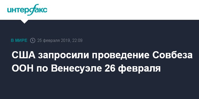 Москва. 25 февраля. INTERFAX.RU - США запросили проведение заседания Совета Безопасности ООН по Венесуэле 26 февраля, сообщает в понедельник агентство EFE со ссылкой на дипломатические источники.