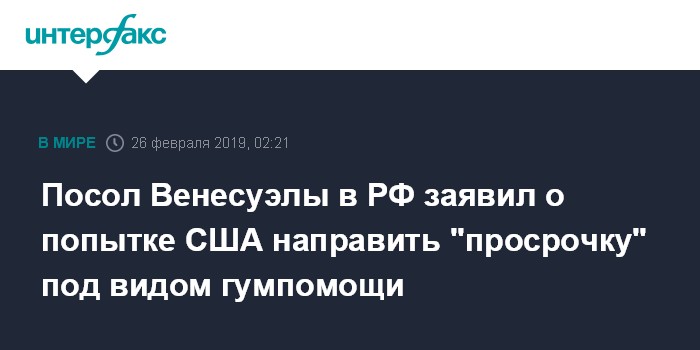 "США направляют (в Венесуэлу - ИФ) продукты, которые никто не проверял. Из источников нам известно, что в их коробках были испорченные продукты питания, просроченные медикаменты и лекарства, непригодные для пользования. Их не проверила ни одна организация, которая занимается такими проверками во всем мире, - речь идет, в частности, о Красном Кресте", - сказал посол.