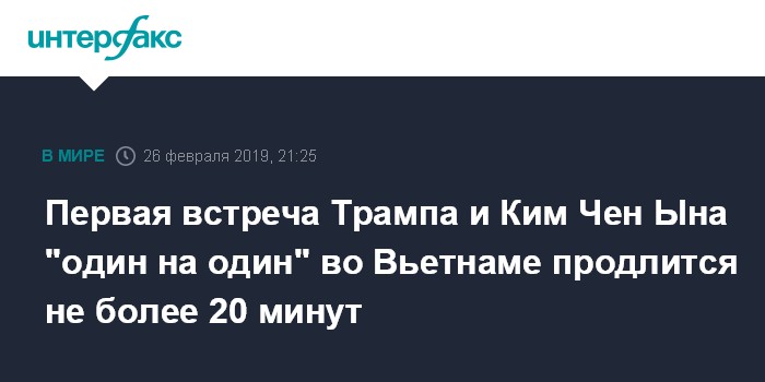 Согласно этому расписанию, встреча "один на один" двух лидеров запланирована на 18:40 по вьетнамскому времени (14:40 по московскому). В программе указано, что далее в 19:00 по вьетнамскому времени состоится ужин, на котором будут присутствовать Трамп и Ким Чен Ын. Соответственно, на их первую личную встречу в Ханое отведено не более 20 минут.