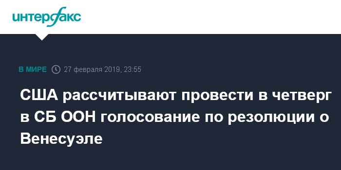 Москва. 27 февраля. INTERFAX.RU - Американское постпредство при ООН планирует в четверг организовать в СБ ООН голосование по проекту резолюции по кризису в Венесуэле, сообщили американские СМИ со ссылкой на неназванных дипломатов.