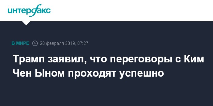 Москва. 28 февраля. INTERFAX.RU - Президент США Дональд Трамп заявил журналистам, что переговоры с лидером Ким Чен Ыном проходят успешно.