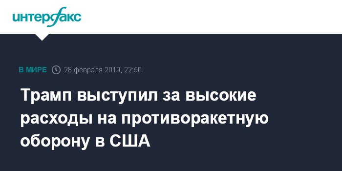 Москва. 28 февраля. INTERFAX.RU - Президент США Дональд Трамп заявил, что настаивает на том, чтобы в стране тратили большие средства на новые технологии противоракетной обороны.