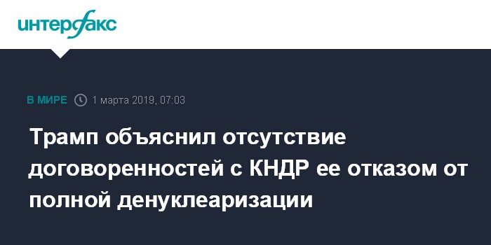 Москва. 1 марта. INTERFAX.RU - Лидер КНДР Ким Чен Ын на переговорах в Ханое отказался от полной денуклеаризации, которой добивались Соединенные Штаты, это стало причиной отсутствия конкретных договоренностей по итогам саммита, заявил президент США Дональд Трамп.