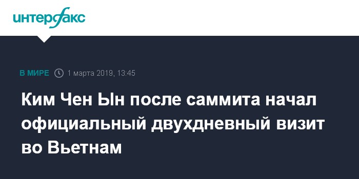 Москва. 1 марта. INTERFAX.RU - Лидер КНДР Ким Чен Ын в пятницу, после завершившегося накануне саммита с президентом США Дональдом Трампом в Ханое, начал официальный двухдневный визит во Вьетнам, сообщает телеканал