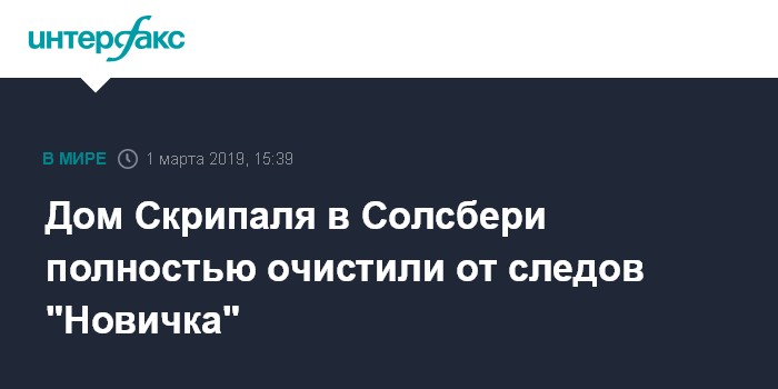 Москва. 1 марта. INTERFAX.RU - Власти Великобритании признали бывший дом отравленного экс-полковника ГРУ Сергея Скрипаля в Солсбери безопасной зоной после очистки от отравляющего вещества типа "Новичок", сообщает телеканал Sky News.