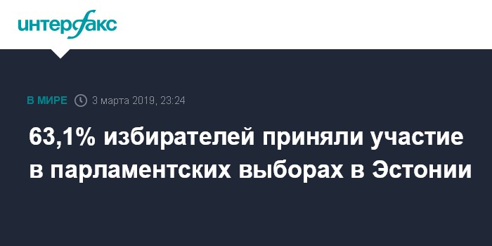 Москва. 3 марта. INTERFAX.RU - На завершившихся в воскресенье парламентских выборах в Эстонии по предварительным данным приняли участие 63,1% избирателей.
