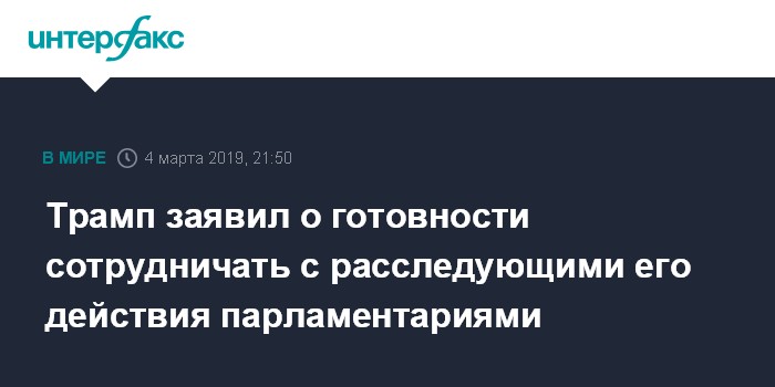 Москва. 4 марта. INTERFAX.RU - Президент США Дональд Трамп в понедельник заявил, что готов сотрудничать с юридическим комитетом Палаты представителей Конгресса, расследующим правомочность действий главы государства и его администрации, сообщает издание The Hill.