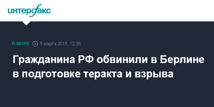 Москва. 5 марта. INTERFAX.RU - Гражданина России обвинили в Берлине в подготовке тяжкого преступления против государства и другого преступления - с применением взрывчатки, сообщает во вторник пресс-служба генпрокуратуры Германии.