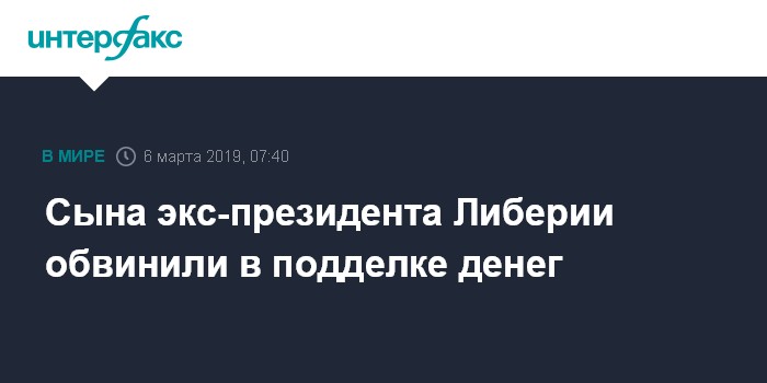 Москва. 6 марта. INTERFAX.RU - Сыну бывшего президента Либерии Эллен Сирлиф предъявили официальные обвинения в подделке денег, сообщил телеканал CNN. Количество подделанных денег исчисляется миллионами долларов.