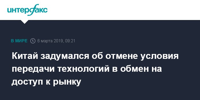 Китай задумался об отмене условия передачи технологий в обмен на доступ к рынку