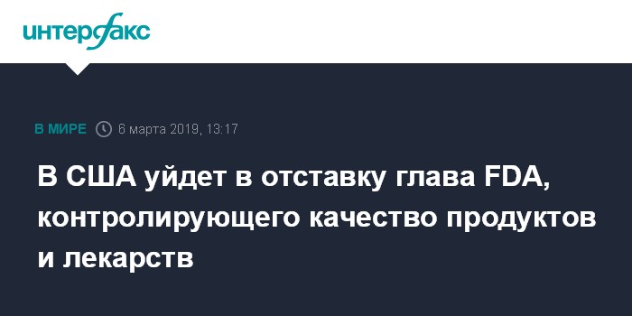 Москва. 6 марта. INTERFAX.RU - Руководитель Управления по контролю качества продуктов питания и лекарственных препаратов (FDA, Food and Drug Administration) США Скотт Готтлиб покидает свой пост, что ставит под вопрос будущее активно продвигавшихся им инициатив, в том числе о запрете сигарет с ментолом и сокращении использования электронных сигарет.