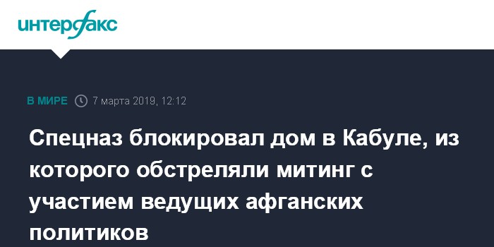 Москва. 7 марта. INTERFAX.RU - Афганский спецназ в Кабуле заблокировал дом, из которого велся минометный обстрел по участникам митинга памяти шиитского лидера Абдула Али Мазари, в котором участвовал премьер страны Абдулла Абдулла и ведущие афганские политики, сообщает в четверг пресс-центр МВД Афганистана.