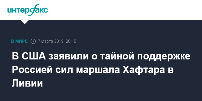 Москва. 7 марта. INTERFAX.RU - Глава Африканского командования вооруженных сил США Томас Вальдхаузер в четверг заявил, что Россия тайно оказывала поддержку в Ливии маршалу Халифе Хафтару с целью закрепиться в стратегически важном для Москвы регионе.