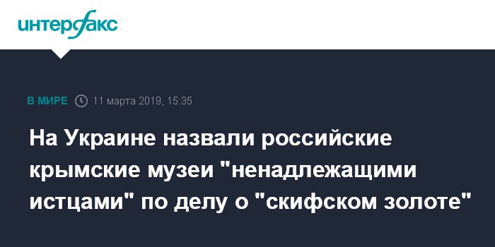 Москва. 11 марта. INTERFAX.RU - В министерстве юстиции Украины заявляют, что зарегистрированные по российскому законодательству крымские музеи, которые являются истцами по делу о "скифском золоте", не имеют отношения к тем правоотношениям, по которым артефакты были переданы в Нидерланды.