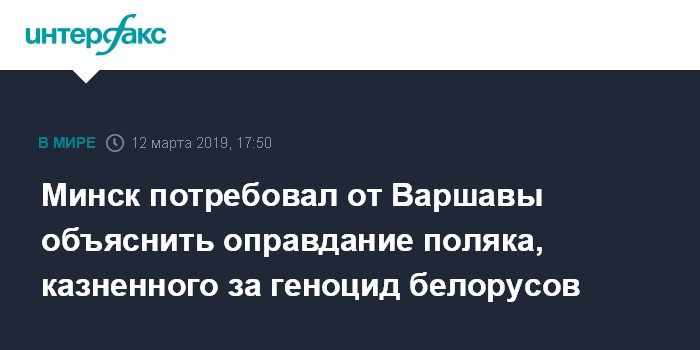 Москва. 12 марта. INTERFAX.RU - Посол Польши в Минске вызван в министерство иностранных дел Белоруссии для пояснений в связи с пересмотром Институтом национальной памяти (ИНП) Польши оценок деяний полевого командира Ромуальда Райса ("Бурого"), казненного за геноцид белорусов.