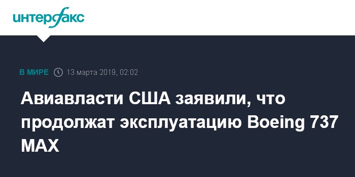 Москва. 13 марта. INTERFAX.RU - Федеральное управление гражданской авиации США (FAA) продолжит использовать самолеты Boeing 737 MAX , следует из заявления, опубликованного на сайте ведомства.