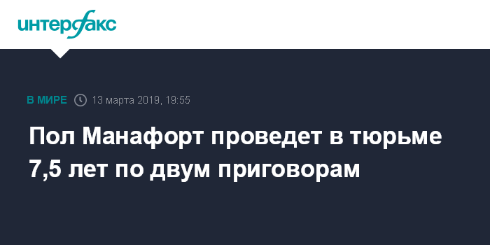Москва. 13 марта. INTERFAX.RU - Суд в США приговорил бывшего руководителя предвыборной кампании президента Дональда Трампа Пола Манафорта в общей сложности к 7,5 годам тюремного заключения, сообщает в среду агентство Bloomberg.