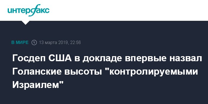 Москва. 13 марта. INTERFAX.RU - Вашингтон в ежегодном докладе Госдепартамента США по правам человека, опубликованном в среду, назвал Голанские высоты "территорией, контролируемой Израилем".