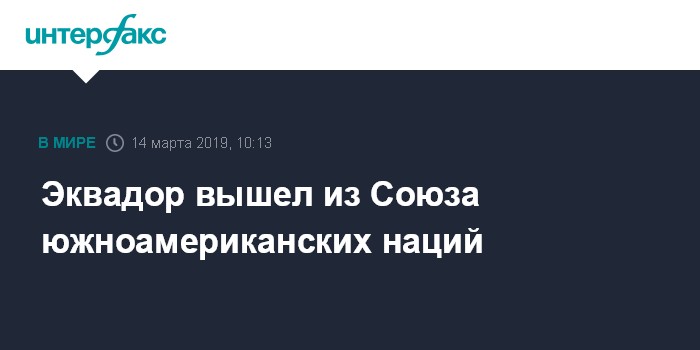 Москва. 14 марта. INTERFAX.RU - Эквадор объявил о выходе из Союза южноамериканских наций (UNASUR), штаб-квартира которого находится в эквадорской столице Кито.