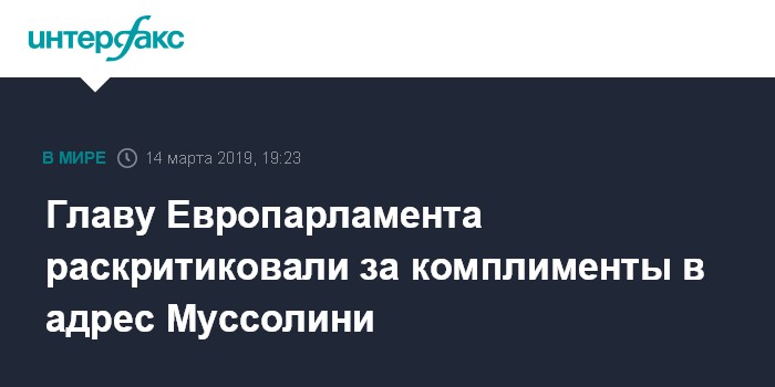 Москва. 14 марта. INTERFAX.RU - Председатель Европарламента Антонио Таяни оказался в центре скандала в связи с заявлениями, в которых он оценил вклад диктатора Бенито Муссолини в развитие Италии.