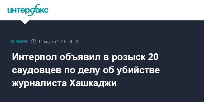 Москва. 14 марта. INTERFAX.RU - Интерпол выдал "красные уведомления" в отношении 20 подданных Саудовской Аравии, которых подозревают в причастности к убийству журналиста Джамаля Хашкаджи, сообщает в четверг турецкая газета Daily Sabah.