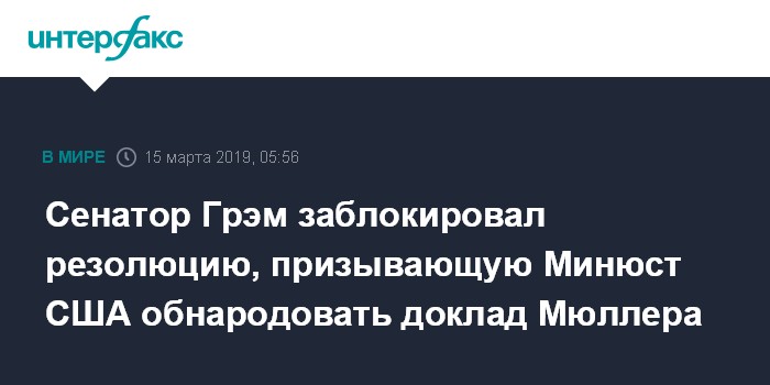 Москва. 15 марта. INTERFAX.RU - Сенатор-республиканец Линдси Грэм заблокировал резолюцию, призывающую Минюст США обнародовать доклад Мюллера, после того как она была единогласно принята в Палате представителей США.