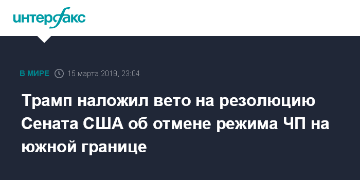 Москва. 15 марта. INTERFAX.RU - Трамп наложил вето на резолюцию Сената США об отмене режима ЧП на границе с Мексикой, сообщило в пятницу издание USA Today.
