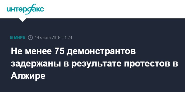 Москва. 16 марта. INTERFAX.RU - Не менее 75 демонстрантов задержаны в результате протестов, прошедших в Алжире в пятницу, сообщает телеканал France 24 со ссылкой на алжирскую полицию.