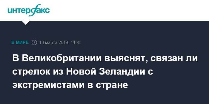 Москва. 16 марта. INTERFAX.RU - Служба безопасности Великобритании (MI5) проводит расследование относительно возможных связей подозреваемого в нападении на мечети в Новой Зеландии с экстремистами в Британии, сообщает в субботу газета The Times.