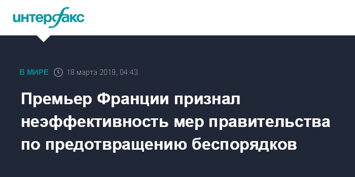 Москва. 18 марта. INTERFAX.RU - Премьер-министр Франции Эдуард Филипп считает, что меры его правительства по предотвращению субботних беспорядков в Париже, вылившихся в погромы и поджоги, оказались недостаточными.
