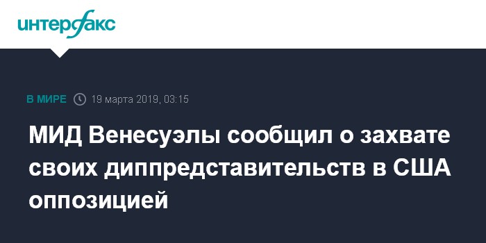 Москва. 19 марта. INTERFAX.RU - Представители оппозиции захватили дипломатические представительства Венесуэлы в США, сообщает министерство иностранных дел Боливарианской республики.