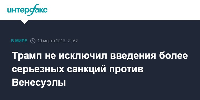 Москва. 19 марта. INTERFAX.RU - Президент США Дональд Трамп во вторник заявил, что введенные США против Венесуэлы ограничительные меры еще не самые серьезные, которые могли бы принять американские власти.