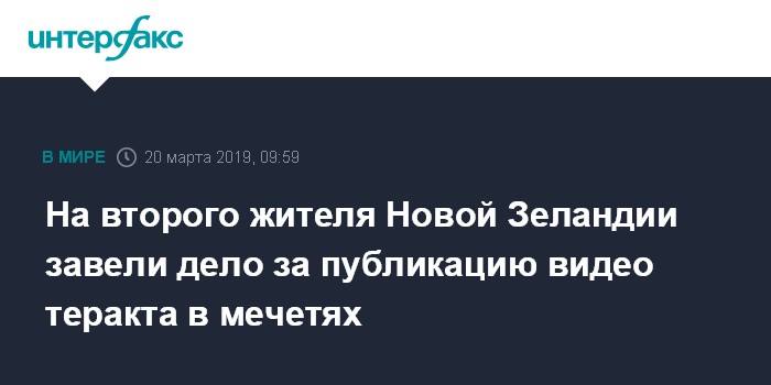Москва. 20 марта. INTERFAX.RU - Мужчине, который опубликовал в интернете видеоролики нападения на мечети в Новой Зеландии, предъявили обвинения в распространении недопустимых материалов, сообщает в среду новозеландское телевидение TVNZ.