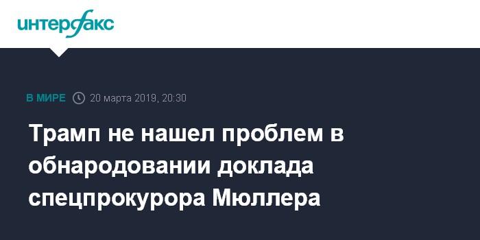 Москва. 20 марта. INTERFAX.RU - Президент США Дональд Трамп не возражает против обнародования для общественности доклада спецпрокурора Роберта Мюллера о возможном вмешательстве РФ в американские выборы, сообщает издание The Hill.