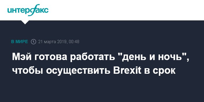 Москва. 21 марта. INTERFAX.RU - Премьер-министр Великобритании Тереза Мэй заявила, что готова "день и ночь" работать для того, чтобы Brexit был проведен вовремя.