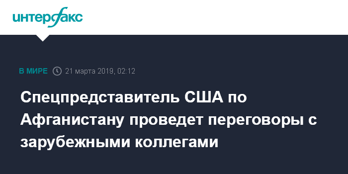 Москва. 21 марта. INTERFAX.RU - Спецпредставитель США по Афганистану Залмай Халилзад обсудит афганское урегулирование с партнерами из России, Китая и ЕС, сообщает госдеп.