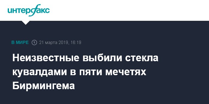 Москва. 21 марта. INTERFAX.RU - Неизвестные в течение ночи разбили оконные стекла в пяти мечетях Бирмингема при помощи кувалд, сообщает в четверг Associated Press.