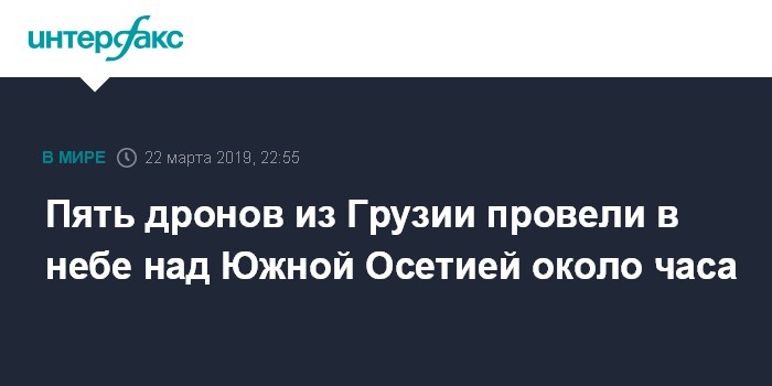 Москва. 22 марта. INTERFAX.RU - Пять беспилотников одновременно пересекли границу Южной Осетии со стороны Грузии и долетели до города Квайса, заявил журналистам глава югоосетинской делегации Егор Кочиев по завершении официальной части встречи в рамках Механизмов по предотвращению и реагированию на инциденты (МПРИ) в пятницу вечером.