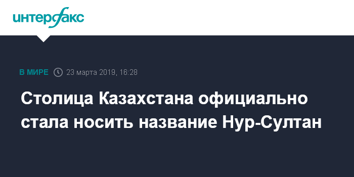Москва. 23 марта. INTERFAX.RU - Столица Казахстана официально стала называться городом Нур-Султан, сообщила пресс-служба Минюста Казахстана. Текст закона "О внесении изменений и дополнений в Конституцию Республики Казахстан" о переименовании столицы страны в город Нур-Султан размещен в эталонном контрольном банке нормативных правовых актов страны.