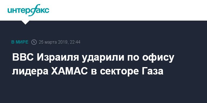 Москва. 25 марта. INTERFAX.RU - Израильская авиация в понедельник вечером нанесла удар по зданию в секторе Газа, в котором расположен офис лидера ХАМАС Исмаила Хании. В это же время палестинцы возобновили ракетный обстрел Израиля, сообщает сайт газеты The Times of Israel.