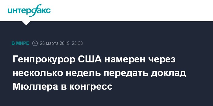 Москва. 26 марта. INTERFAX.RU - Генпрокурор США Уильям Барр планирует через несколько недель передать в конгресс доклад спецпрокурора Роберта Мюллера о не подтвердившихся данных о сговоре между РФ и предвыборным штабом Дональда Трампа, сообщил телеканал Fox News.