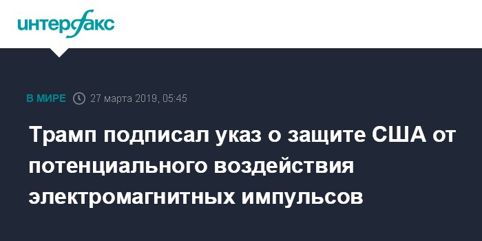 Москва. 27 марта. INTERFAX.RU - Президент США Дональд Трамп подписал указ, предписывающий федеральным агентствам выявлять угрозы, создаваемые электромагнитными импульсами, и находить способы защиты от них, пишет The Hill.