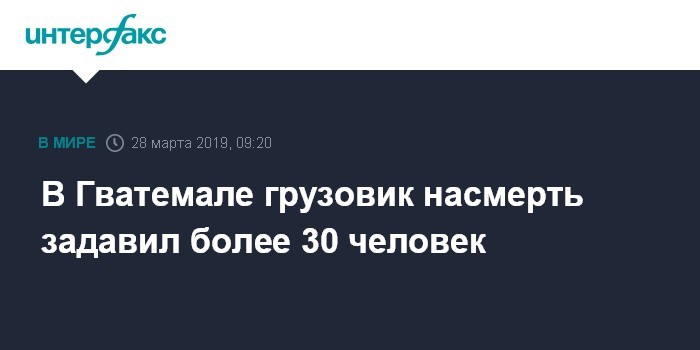 Москва. 28 марта. INTERFAX.RU - Более 30 человек погибли в среду (по местному времени) в Гватемале в результате наезда грузовика, сообщает в четверг агентство EFE.