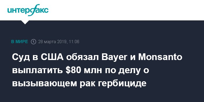 Суд в США обязал Bayer и Monsanto выплатить $80 млн по делу о вызывающем рак гербициде