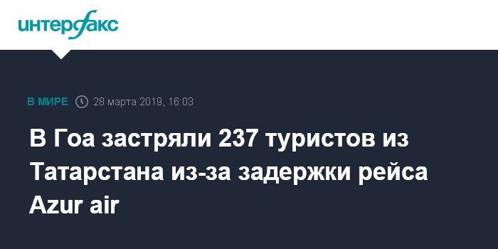 Москва. 28 марта. INTERFAX.RU - Из Гоа (Индия) уже более суток не могут вылететь 237 туристов из Татарстана из-за задержки рейса авиакомпании Azur air.