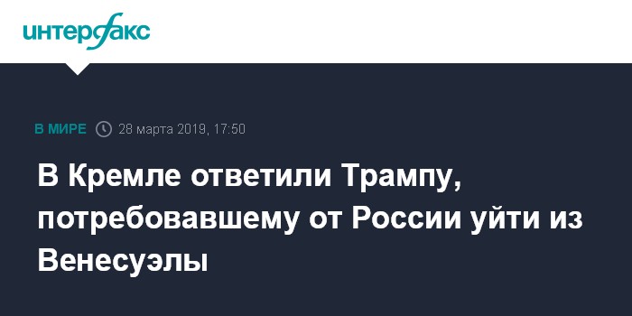 Так он ответил на вопрос о том, как в Кремле восприняли прозвучавшие накануне угрозы президента США Дональда Трампа в связи с российским военным присутствием в Венесуэле, а также призывы вице-президента США Майкла Пенса прекратить контакты с президентом Венесуэлы Николасом Мадуро.