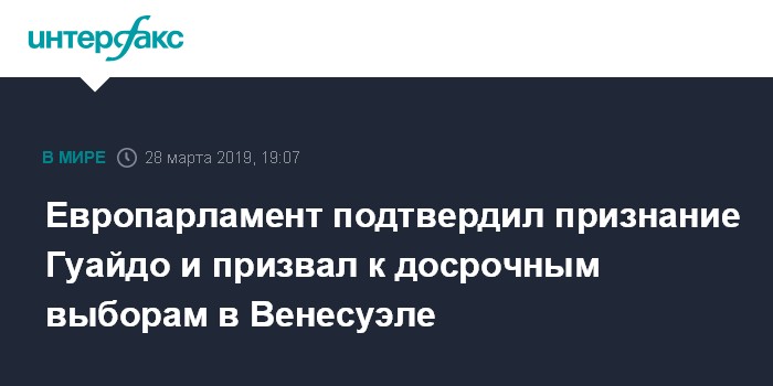 Москва. 28 марта. INTERFAX.RU - Европейский парламент принял в четверг на пленарной сессии в Страсбурге резолюцию в поддержку мирного решения кризиса в Венесуэле путем организации свободных, прозрачных и заслуживающих доверия президентских выборов.