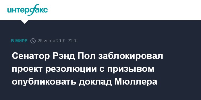 Москва. 28 марта. INTERFAX.RU - Сенатор-республиканец Рэнд Пол в четверг заблокировал проект резолюции, призывающий Минюст США опубликовать доклад Роберта Мюллера по "российскому делу", пишет газета The Hill.